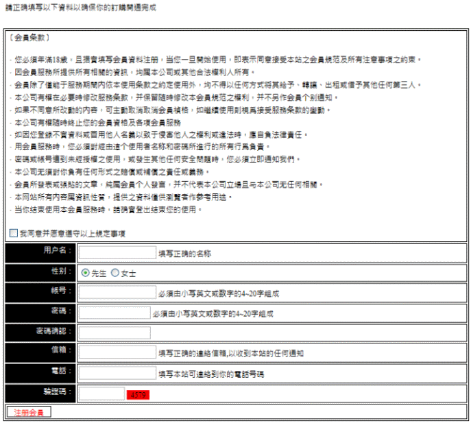 2.正確填寫所有資料,填寫後日後無法修改,信箱請正確填寫否則日後無法收到本站所有通知信